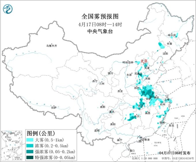 人民网北京4月17日电 (记者温璐、高清扬)据中央气象台网站消息,4月17日早晨,京津冀、山东、河南、安徽、湖北、湖南等多地出现大雾天气,上述部分地区有能见度不足200米的强浓雾。中央气象台4月17日早晨继续发布大雾黄色预警:预计4月17日早晨至上午,北京东南部、天津西部、河北中南部、河南北部和东部、安徽、湖北东部、湖南中部、浙江北部和东南部、福建东部等地部分地区有大雾,局地有能见度不足200米的强浓雾。建议驾车出行公众密切关注最新天气和交通信息,提前规划行程,行车谨慎慢行,注意保持安全车距。